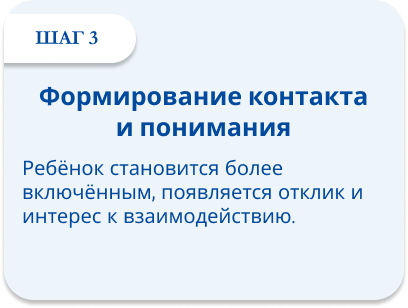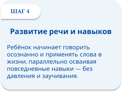 - Фокус на понимание и контакт, а не на заучивание. Речь появляется как следствие понимания, инициативы и взаимодействия.